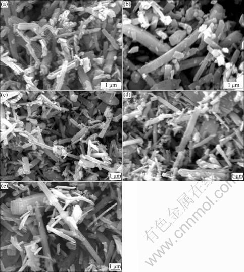 Fig.4 SEM images of TiO2-B prepared for different times from K2Ti4O9: (a) 6 h; (b) 12 h; (c) 24 h; (d) 36 h; (e) 48 h