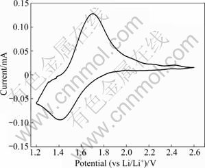 Cyclic voltammetry is an effective analytical method for understanding the mechanism of Li+ inserting and extracting of TiO2-B. Fig.5 shows the cyclic voltammogram of TiO2-B (24 h). A pair of redox peaks are observed on the CV curve at 1.42 V and 1.70 V vs Li/Li+, for cathodic and anodic scans, respectively, which demonstrates the typical behavior of Li insertion/ extraction processes in TiO2-B electrode. The redox peaks of TiO2-B (1.70 V/1.42 V) are lower than those of other polymorphs, with 1.95 V/1.75 V [15], 1.90 V/ 1.75 V [16] and 2.02 V/1.7 V [17] for anatase, rutile and brookite, respectively. This means that the cells, incorporating a TiO2-B anode, would have higher voltage than that based on other polymorphs of TiO2.