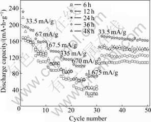Fig.7 shows the cycle performance of TiO2-B electrode, obtained at various calcining times, as a function of cycle number at different current densities. All the samples have good cycleability. For the TiO2-B obtained at calcining time of 24 h, the capacity retention is about 82.3% for the second discharge capacity after 50 cycles. Combined with XRD and SEM, it is shown that both the crystallinity and morphology exert a significant influence on the rate performances of TiO2-B. The sample calcined for 6 h, with the least particle size, has low discharge capacity, due to the low crystallinity. While the sample calcined for 48 h, with the highest crystallinity, also has low discharge capacity, due to the large particle size. Therefore, the sample calcined for 24 h, with the moderate crystallinity and particle size, exhibits the highest discharge capacity and rate performances. The first diacharge capacity is 231.6 mA?h/g, and the rate capacity is 73.2 mA?h/g at 1 675 mA/g.