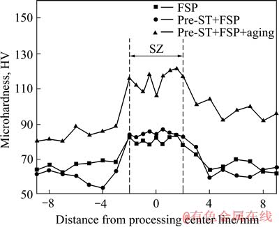 Fig. 7 Microhardness distribution of AZ91 magnesium alloy under different processing conditions