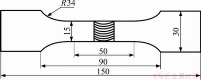 实验选用中厚度AA2219-T87铝合金板材,母材尺寸为180 mm×100 mm×6 mm。其化学成分如下表1所示,母材的抗拉强度是445MPa,断后伸长率是13%。搅拌摩擦焊接实验在北京CFSW 技术有限公司设备FSW-TS-S08上进行,焊接平台如图1,焊接参数如下:转速为800 r/min,焊接速度为160 mm/min,搅拌头倾角为1.5°。搅拌头材料为H13钢,轴肩直径为15 mm,搅拌针根部直径6 mm,端部直径3 mm,针长5.8 mm。SANTOS等提出铝合金对电流不敏感,需要大电流才能显著提升铝合金载流搅拌摩擦焊接效果,所以本文选取的脉冲直流电流平均值为0、400和600 A,脉冲频率为30 Hz,脉冲占空比为50%。焊后将工件沿横截面用线切割机切割制成金相试样,打磨抛光后用Keller试剂(1.0%HF+1.5%HCl+2.5%HNO3+95.0%H2O)对金相试样进行腐蚀,采用OLYMPUS LEXT 3100激光共聚焦显微镜观察各金相试样的显微组织,用FEI Quanta200型扫描电镜对拉伸试样断口进行观察。按GB/T 2649—1989《焊接接头机械性能试验取样方法》和 GB/T 228—2002《金属材料室温拉伸试样方法》沿垂直焊缝方向制取拉伸试样,如图2所示,用CSS-1110型电子万能试验机进行室温拉伸实验,拉伸速率为2 mm/min。用DHV-1000显微维氏硬度计进行显微硬度测试,间隔0.5 mm取点,试验力为0.98 N,载荷时间为15 s。
