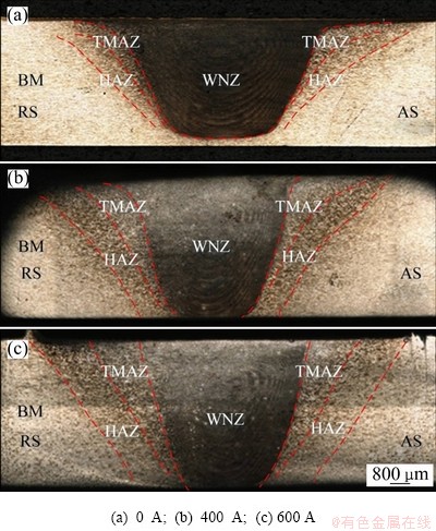 1) 载流搅拌摩擦焊接增加了焊缝区横截面区域面积,同时焊缝面积随着电流数值的变大而变大,其中热影响区面积提升明显。电流参与搅拌摩擦焊接,增强了原焊接参数的热输入,改变了原焊核区、热机影响区、热影响区的晶粒形貌和分布。