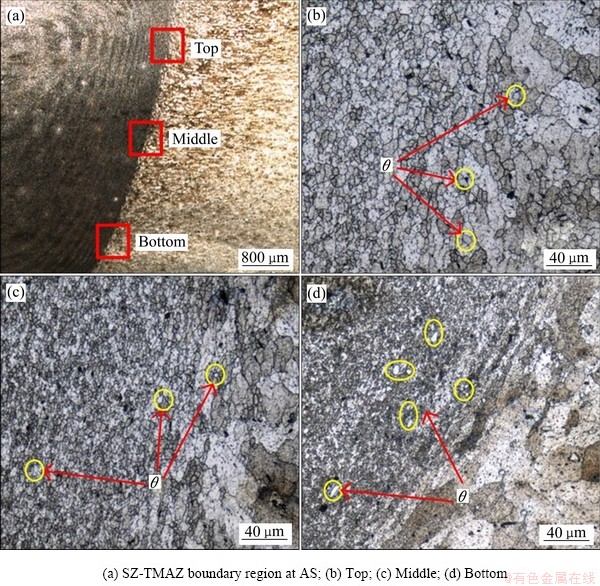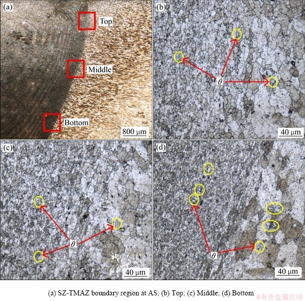 搅拌区塑性材料受搅拌针搅拌作用,材料流动形态影响析出相在前进侧和后退侧分布情况,同时同一焊接接头截面上、中、下部显微组织分布情况也不相同。图4所示为有效电流为400 A脉冲载流搅拌摩擦焊接接头搅拌区与热机影响区过渡区的显微组织对比图,其中可以看到位于上、中部搅拌区存在极少量θ相(Al2Cu),而在搅拌针底部区域出现较多θ相,同时发现θ相聚集现象。图5所示为有效电流为600 A脉冲载流搅拌摩擦焊接接头搅拌区与热机影响区过渡区域的显微组织对比图,其出现与图4相同的分布情况,但图5(d)中的θ相较图4(d)中的θ相形状大。出现这种情况可能是在搅拌区,上、中、下不同区域受搅拌针搅拌和塑性材料流动作用不同,同时两接头受到大小不同的脉冲电流影响,600 A脉冲电流情况下,热输入更高,析出相发生粗化,造成形状大小不同[17]。同时,从图中均能发现搅拌区从上到下的晶粒尺寸逐渐变小,上部受搅拌头轴肩作用,热输入最大,晶粒动态再结晶过程中,受到热量积累最多,使得晶粒最大。