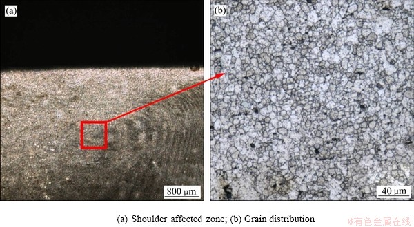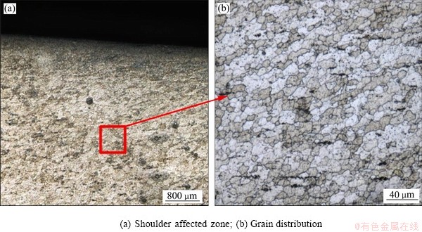 在传统搅拌摩擦焊接过程中,轴肩影响区(SAZ)位于搅拌区上端,搅拌头轴肩下侧,受轴肩机械摩擦作用,显微组织由细小等轴晶构成。大量热源分布在轴肩与母材,下侧材料在塑性状态下做高速旋转,轴肩影响区材料运动速度不同,存在速度梯度,轴肩影响区发生动态随机再结晶现象,同时受到轴肩较大的向下锻压力,晶粒在再结晶过程中来不及长大,便形成细小等轴晶粒。