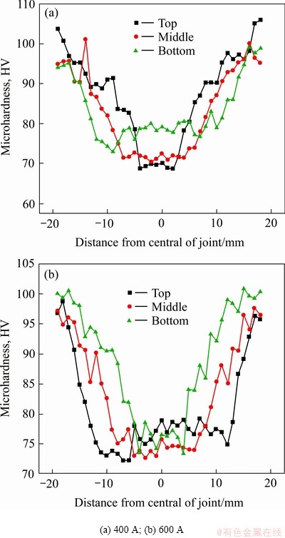 Fig. 8 Microhardness distribution profile of welding joint with different pulse currents