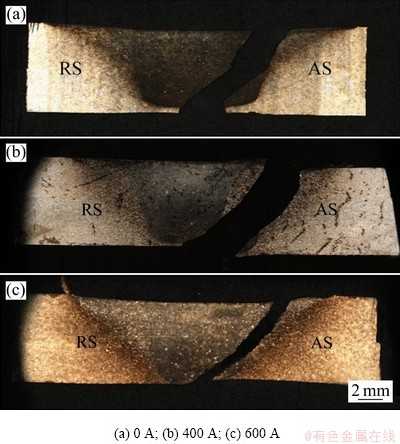 图9 不同脉冲载流搅拌摩擦焊接接头断口宏观形貌
