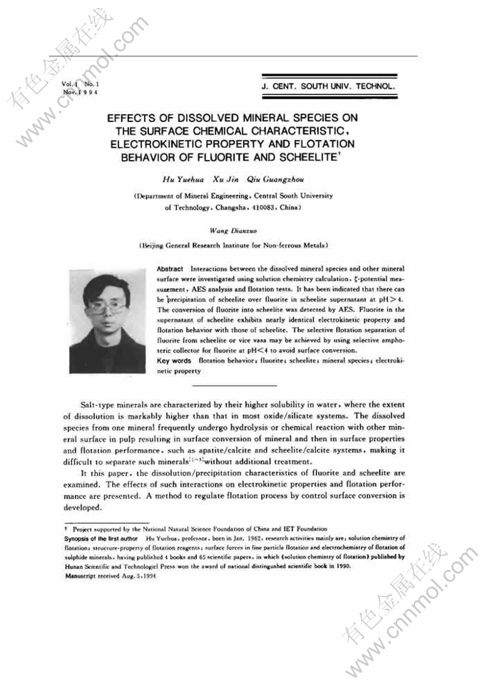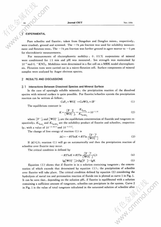 EFFECTS OF DISSOLVED MINERAL SPECIES ON THE SURFACE CHEMICAL CHARACTERISTIC,ELECTROKINETIC PROPERTY AND FLOTATION BEHAVIOR OF FLUORITE AND SCHEELITE