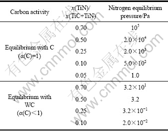 Table 3 Relationship between nitrogen equilibrium pressure and mole fraction of TiN in Ti(C,N) solid solution at 1 450 ℃