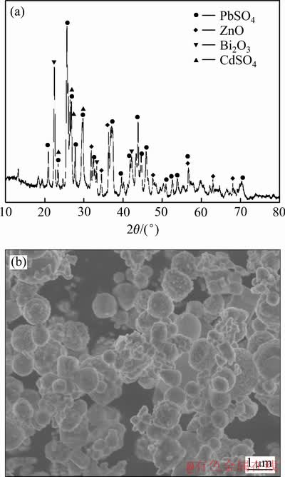 实验所用含镉烟灰由山东恒邦冶炼股份有限公司提供,其主要元素的化学分析结果如表1所示。可以看出,该烟灰中Cd含量高达19.90%,还含有少量的As,属于高毒性冶金副产物。原料的XRD分析结果如图2(a)所示,可以看出,含镉烟灰中元素Pb、Cd主要以硫酸盐形式存在,Zn、Bi则主要以氧化物形式存在。镉烟灰的SEM像(见图2(b))表明,烟灰的颗粒主要呈1 μm左右的球形,少数为不规则颗粒,整体粒度极细。