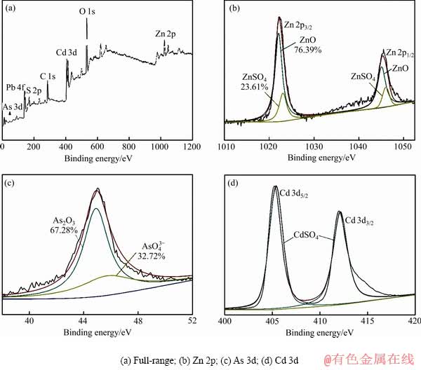 采用XPS对烟灰中的各元素的结合态进行分析,从图3的全谱中可以看出,样品具有明显的Zn 2p、As 3d、Cd 3d、Pb 4f和O 1s的谱线,与化学分析显示的元素组成一致。对Zn 2p的XPS谱图进行拟合,结果表明Zn是以ZnO和ZnSO4两种组成存在(见图3(b)),其中位于1022.1 eV的Zn 2p3/2为ZnO,位于1023.05 eV的Zn 2p3/2证明了原料中还存在少量的ZnSO4,根据峰面积可得到ZnO和ZnSO4的比例为76.39%和23.61%。As 3d的XPS谱图(见图3(c))表明As以2种化学态存在,其中位于44.9 eV的As 3d为As2O3,而位于45.7 eV的则为