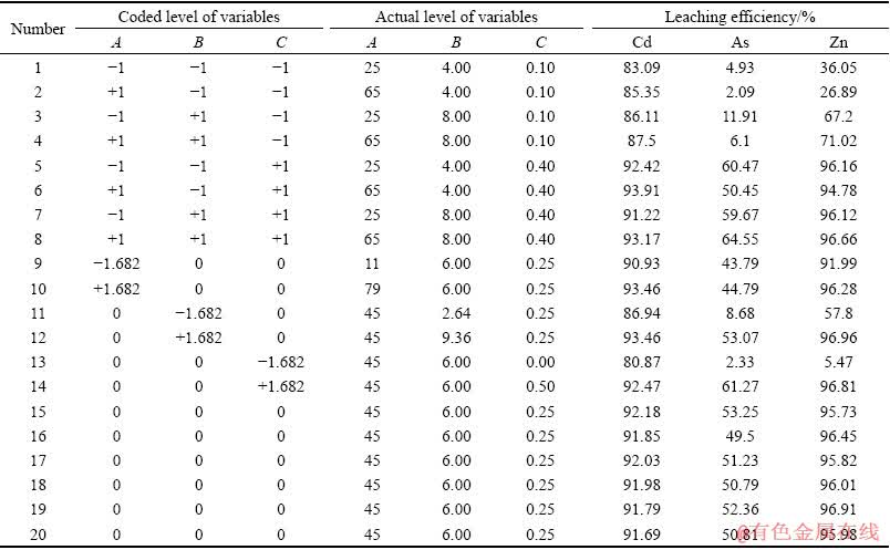 表3 镉烟灰浸出过程CCD实验方案和实验结果