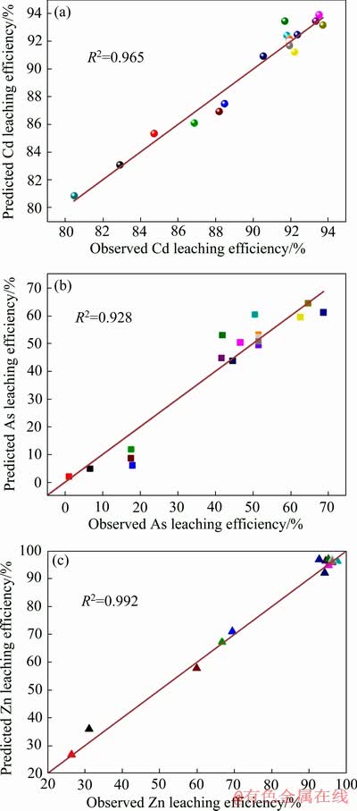 由图4可知,各金属转化率的预测值与实验值拟合所得直线斜率为45°左右,各数据点在直线两侧随机分布。Cd、As和Zn的预测浸出率与实验所得各金属浸出率间具有很好的直线关系,线性相关系数R2分别为0.965、0.928和0.992,表明该模型对实际情况有较好的拟合效果。