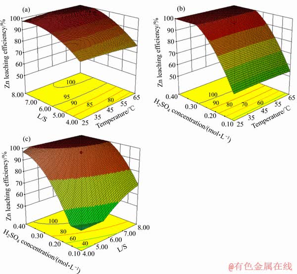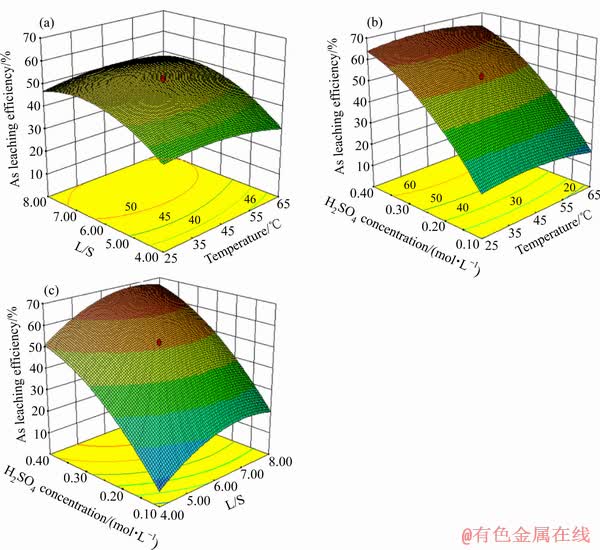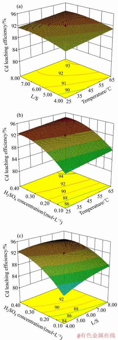 2)采用响应曲面设计方法中的中心复合设计法,对硫酸浸出镉烟灰的过程进行了优化,构建了Cd、As、Zn浸出率与反应温度、液固比及硫酸浓度等因素之间的数学模型,并重点研究了影响因素在Cd、As、Zn浸出过程中的交互影响关系。