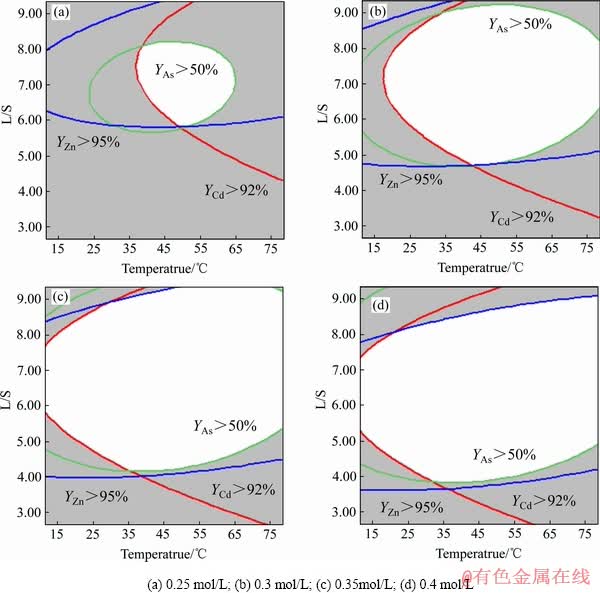 15软件的重叠等值线功能,依次模拟了硫酸浓度为0.25、0.3、0.35、0.4 mol/L时,Cd浸出率高于92%、Zn浸出率高于95%、As浸出率高于50%的区域,如图8所示,图中白色区域即为目标区域。由图8可知,随着硫酸浓度的逐渐升高,白色区域面积逐渐增大,且向低液固比区扩展的趋势明显,说明酸用量满足一定要求时,便不再是浸出的关键控制因素。