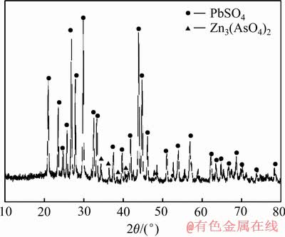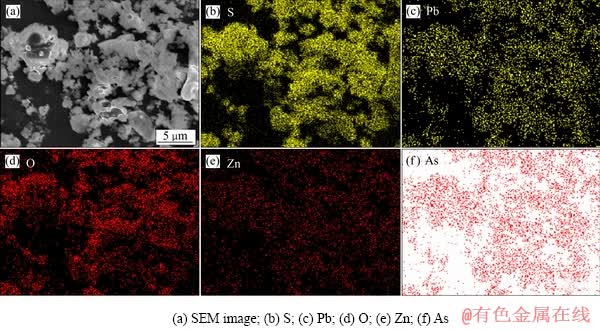 图9为浸出渣的XRD谱,可以看出其主要组成为硫酸铅;相比原料的XRD谱,浸出后CdSO4及ZnO的衍射峰消失,并出现明显的Zn3(AsO4)2的衍射峰,这进一步验证了镉烟灰中砷酸盐的存在。此外,浸出过程中As难以完全溶出,其主要原因就是砷酸锌在弱酸条件下难以分解,而在Zn 2p的XPS谱图中未检测到砷酸锌的存在,则是因为其相对含量较少。由浸出渣的EDS分析(见图10)可以看出,其主要的元素分布为Pb、S、O,未分解的As和Zn分布相同且均匀分布于浸出渣中,难以观察出独立矿物,这也表明在浸出过程中砷酸锌受主体矿物的影响,与浸出剂接触面积小,难以被溶出。