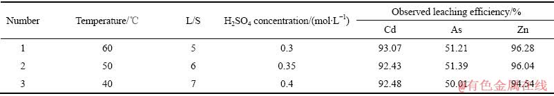 根据图9所示的等值线叠加图,在优化目标区域内的选取任意实验点开展验证实验,用于考察二阶拟合模型对金属浸出效果拟合的合适性和准确性,结果如表4所示。从表4中可知,实际浸出率与理论预测值吻合较好,说明采用响应曲面法对含镉烟灰硫酸浸出过程进行优化是比较成功的。