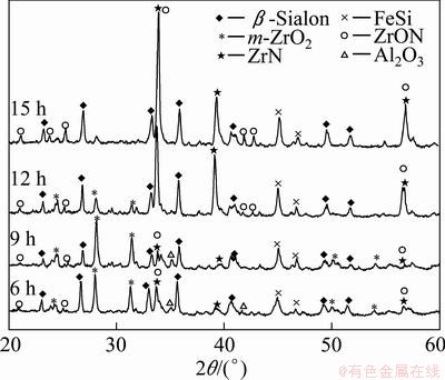 . It indicates that the β-Sialon can be easily formed from Al2O3 and SiO2 by the CTRN reaction. However, the CTRN reaction of ZrO2 to form ZrN is very difficult. Increasing holding time to 12-15 h benefits the formation of ZrN (Fig. 2).