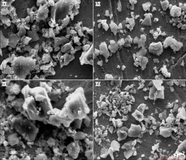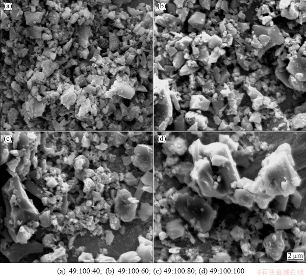 Figure 3 shows the SEM images of the samples with different raw materials composition (mz:mf:mc) synthesized at 1550 °C for 12 h. There exist many fine particles in the sample with mz:mf:mc values of 49:100:40 and 49:100:60 (Figs. 3(a) and (b)), and their average grain size is about 1 μm. EDS analysis and XRD pattern (Fig. 1) indicate that they are ZrO2. Some big particles with an average grain size of 2-3 μm can also be observed. They consist of Si, Al and O elements. Combining with the XRD pattern as shown in Fig. 1, they are mullite. Increasing carbon content in a sample (Figs. 3(c) and (d)) can promote the CTRN reaction and make the fine particles grow up.