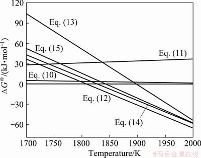 for Eqs. (12)-(15), respectively, become negative at about 1630 °C, and they decrease sharply as increasing the temperature. At 1550 °C, the △GΘ values for Eqs. (10)-(15) are as follows: