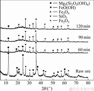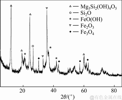 对原矿进行物相分析,图1所示为原矿的XRD谱。由图1可以看出,矿相的主要成分为蛇纹石(Mg3[Si2O5(OH)4])、针铁矿(FeO(OH))、二氧化硅(SiO2)和铁的氧化物(Fe3O4、Fe2O3),结合矿石的化学成分,可认为其属于硅镁质型红土镍矿。