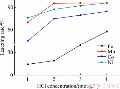 Fig.4 Influence of hydrogen chloride concentration on leaching rate of metals
