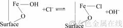 采用盐酸-氯化铵溶液体系浸出红土镍矿,盐酸提供氢离子产生溶液的酸性环境。向盐酸溶液中加入氯化铵,增加氯离子的含量,可以提高酸性溶液中氢离子活度[28-29],相比较传统工艺只有在8 mol/L的高酸条件下才能获得较高的浸出率[30],该工艺显著降低了酸的使用[31]。实验表明,盐酸-氯化物溶液与针铁矿中镍和铁的浸出有着密切的关系。在较低的温度下,主要是溶液中酸对针铁矿浸出,酸的浓度是影响矿物浸出的主导因素,而在温度超过80 ℃时,金属离子的浸出不仅取决于酸的浓度,还取决于氯离子的浓度。首先针铁矿的表面进行水合,随后通过质子和氯离子的吸附到表面部位,进而达到溶解的效果[32]。氯盐溶液溶解针铁矿的机理可表示为,在针铁矿表面与氯离子结合形成铁氯的配合物,其反应如下: