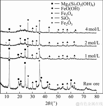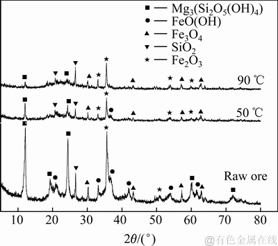 结合矿物浸出过程中可能发生的反应方程式可以看出,酸性环境对矿物的溶解有决定性的作用,而矿物的溶解过程直接决定金属离子的浸出行为。因此,研究矿物中不同矿相在酸溶液中溶解变化过程十分重要。由原矿的XRD谱可知,红土镍矿存在的主要矿相为:蛇纹石矿相(Mg3[Si2O5(OH)4])、针铁矿矿相(FeO(OH))、赤铁矿矿相(Fe2O3)和磁铁矿矿相(Fe3O4)。通过对不同条件下矿物的浸出渣中的XRD分析可以得出各主要矿相在浸出时发生的变化,进而分析红土镍矿在酸性溶液中的浸出机理。