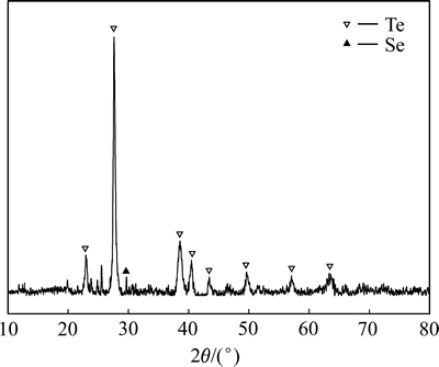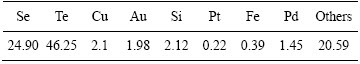 由表2可知,还原产物中含硒24.90%,含碲46.25%,其总量高达71.15%;还原产物中金、铂和钯含量分别为1.45%、1.98%和0.22%,其总量为3.65%,由于其中贵金属铂钯含量较高,因此称之为铂钯精矿,具有很高的回收价值。由图1可知,还原产物中硒和碲均以单质状态存在。由图2可知,还原产物主要呈粉末状和柱状体。