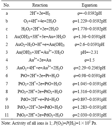 Table 5 Equilibrium reactions of Au-H2O2-H2O, Pt-H2O2- H2O and Pd-H2O2-H2O system and φ-pH equations at 298.15 K