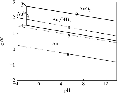由图5可知,虚线a、b之间为水的热力学稳定区域,c为双氧水的φ-pH曲线,双氧水的电位随着pH的升高逐渐降低。水溶液中单质Au可以稳定存在。当单质Au被氧化时,不同pH条件下,氧化产物不同,pH<-2.31时,Au可被双氧水氧化成Au3+;-2.31<pH<14时,Au可被双氧水氧化成Au(OH)3,Au3+、Au(OH)3不稳定,在一定条件下均可转化为AuO2[21]。