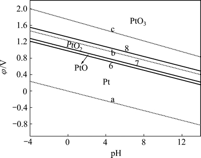 由图6可知,水溶液中单质Pt可以稳定存在。当单质Pt被双氧水氧化时,随着氧化还原电势的升高,Pt表现的形态依次为PtO、PtO2、PtO3,均以固态氧化物的形式稳定存在。