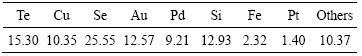 由表7可知,铂钯精矿经过双氧水氧化碱浸后,Se和Te含量分别为25.55%和15.30%,其总量为40.85%,贵金属Au、Pt和Pd的含量分别为12.57%、1.40%和9.21%,其总量为23.18%。与铂钯精矿(见表2)对比可知,Se和Te总量由71.15%下降到40.85%,贵金属总量由3.65%增加到23.18%,Au、Pt和Pd均未被浸出,富集了6.35倍。由图10可知,氧化碱浸后的产物中有SiO2、Te、Au、Pd、Se。由图11可知,所得产物形貌主要呈柱状体,与铂钯精矿比较,粉末状物质消失。