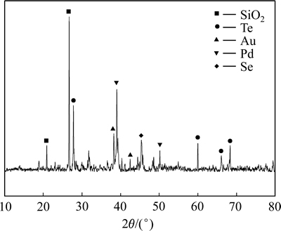 分析检测结果表明,沉金后液中硒的还原率为96.77%,碲的还原率为98.09%,金铂钯完全还原。将多次实验所得还原产物混合后检测其化学成分如表2所列,XRD和SEM分析结果分别如图1和图2所示。