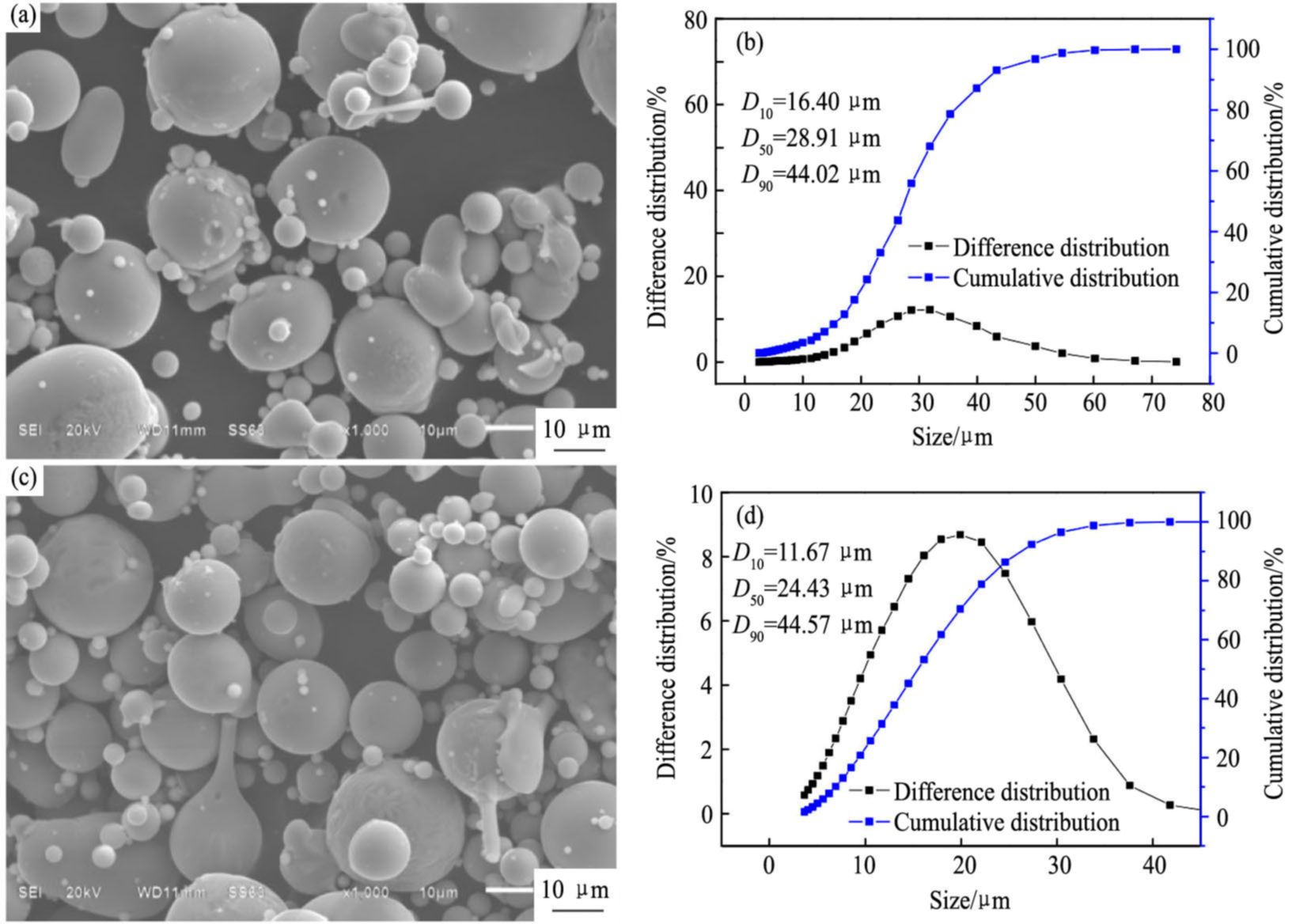 Fig.1 SEM image of Fe-based amorphous powders (a), size distribution of Fe-based amorphous powders (b), SEM image of Al-based amorphous powders (c), size distribution of Al-based amorphous powders (d)