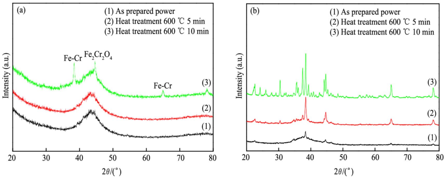 为进一步分析Fe基和Al基非晶粉末稳定性, 将其在600 ℃下热处理5 min, 发现Fe基非晶粉末600 ℃热处理后非晶结构基本保持稳定, 但10 min后非晶粉末XRD图发生较大变化。 Al基非晶呈现与Fe基非晶基本相同的规律, 但Al基非晶晶化程度在相同条件下较Fe基非晶粉末更为严重。 由此可判定Fe基非晶粉末非晶含量高且更为稳定, 而Al非晶含量低且稳定性稍差, 对温度敏感性较强。 从涂层制备工艺角度来说, 为获得较多的非晶结构, Al基非晶对喷涂工艺参数的控制更为严格。