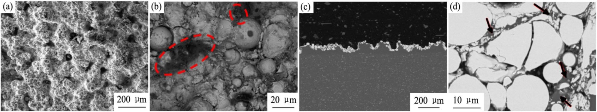 根据非晶粉末热处理XRD图谱, 将冷喷涂气体温度控制900 ℃以内。 尽管采用3种工艺参数, 但依然无法形成有效涂层, 其中Fe基涂层表面形貌及断面组织如图3所示, 由低倍形貌照片可以看出(图3(a)), 与喷砂后基材相比, 涂层表面粗糙度显著提高, 并在局部区域可发现尺度介于50~100 μm的凹坑。 背散射电子模式下拍摄的高倍形貌照片(图3(b))显示有如红色虚线框标示的区域未被铁基非晶涂层覆盖, 此类区域的面积约占总表面积的10%左右。 同时还发现部分铁基非晶粉末仍呈现球形, 表明其在现有喷涂参数条件下仍未能发生有效塑性变形。 图3(c)所示, 由于大粒径非晶粉末冲蚀作用, 涂层表面轮廓呈现出凹凸不平的锯齿状外形特征。 铁基非晶涂层的厚度介于20~40 μm之间。 高倍断面组织照片显示(图3(d))涂层内有部分铁基非晶颗粒出现了开裂现象, 同时很大一部分铁基非晶颗粒仍呈现为球形或近球形特征, 表明其在高速碰撞沉积过程中未发生有效的塑性变形。 另外, 如箭头所示, 铁基非晶涂层当中可发现呈现为暗色的7075铝合金基材的卷入。 试验过程中发现, 即使增加喷涂的遍数, 涂层的厚度也不会继续增加。 由于当前采用的冷喷涂系统为国际先进的高压冷喷涂装备, 本研究采用的气体工作温度和气体工作压力均接近该设备的上限, 更高工艺参数并未进行。 以上结果表明: 采用当前粉末不能通过冷喷涂获得较大厚度的无缺陷铁基非晶涂层。 主要原因如下: 当前采用的铁基非晶粉末硬度较高(HV 900), 且高熔点Mo元素的加入使其高温稳定性好。 较高的硬度使其在气体压力高达4.5 MPa的极端加速条件下难以获得有效的塑性变形。 其次, 极佳的热稳定性使铁基非晶粉末即使在900 ℃的气体加热下难以得到有效软化。 冷喷涂颗粒之间的结合是以颗粒高速碰撞引发的剧烈塑性变形形成的, 该铁基非晶粉末的上述特征导致其变形能力较差, 因此难以获得高质量的涂层。 同理, Al非晶粉末也呈现类似的特征, 形貌如图4所示。 因此采用冷喷涂工艺直接喷涂Fe基和Al基非晶涂层, 形成非常困难, 这是巨大的挑战, 也是今后研究的重点方向。 因此为了将非晶粉末沉积成涂层, 本研究再采用大气等离子喷涂工艺制备非晶涂层。 因以往有大量文献
