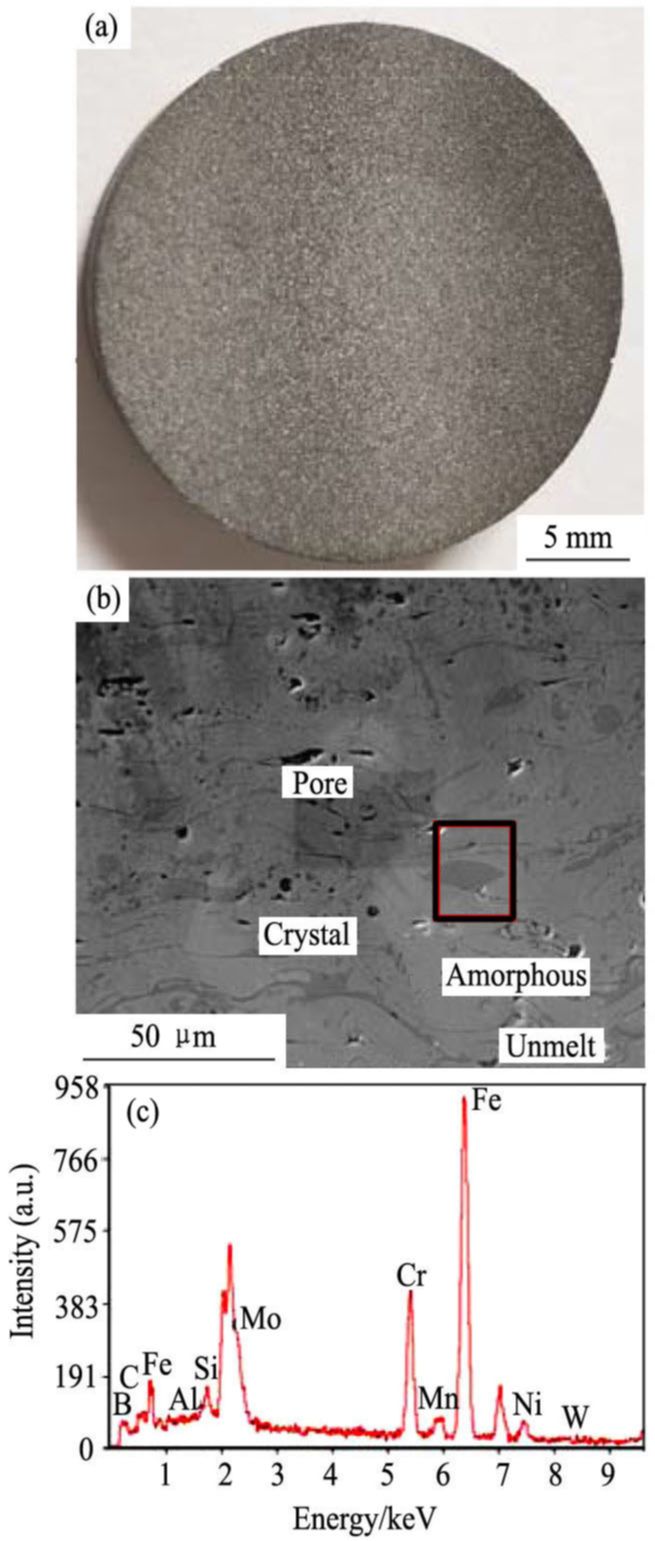 Fig.5 Fe-based amorphous coatings of surface morphology (a), section morphology (b) and EDS analysis of rectangular frame (c)