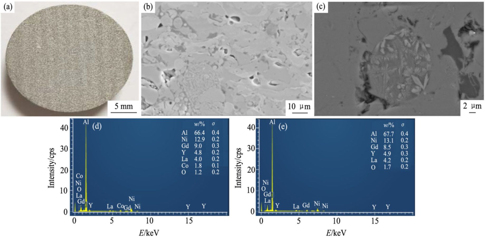 Fig.6 Al-based amorphous coatings for surface morphology (a), low magnification section morphology (b), high magnification section morphology (c), EDS of red crucifix (d) and EDS of green crucifix for sections (e)