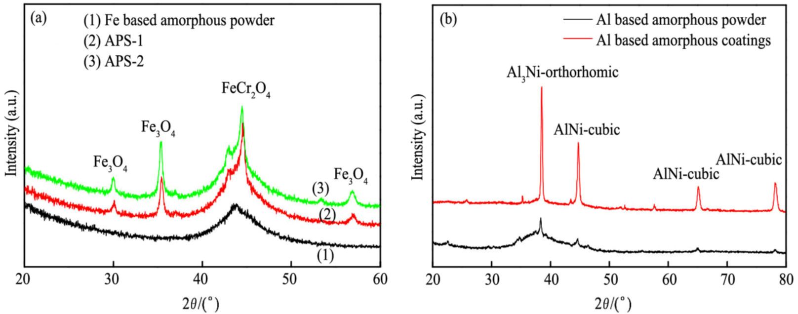 Fig.7 XRD patterns for Fe-based (a) and Al-based amorphous coatings (b)