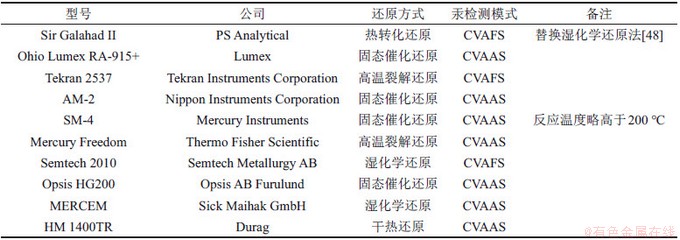 国外对汞的监测研究起步较早,20世纪90年代便开始了对Hg-CEMS和Hg-SCEMS(汞半连续在线监测系统)的研发,21世纪初便开始在燃煤电厂进行安装和测试。因此,目前商业流通的几种汞在线监测设备主要是由国外公司设计生产制造。不同公司也采用了不同的氧化态汞还原策略,其各有优劣。表3所示为多种商业流通Hg-CEMS产品中的氧化态汞还原模块进行对比[48]。