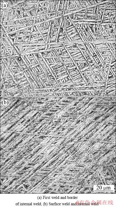 在窄间隙的多层单道焊接中,焊缝金属快速冷却,原始β相来不及通过扩散变成平衡的α相,而是通过原子集体有规律近程迁移来实现切变相变,从而获得针状马氏体组织[13]。除针状马氏体α′相外,还存在极少量的残余β相。焊接时,部分β相从高温快速冷却过程中来不及转变而残留在针状马氏体的晶界处[14]。焊缝呈现典型的篮网状组织,先焊焊道及焊道交界处的热量散失大、冷却速度快,造成组织的迅速转变,形成了细小杂乱的马氏体组织(图4(a))。而处于表层焊道、内部焊道中心的组织为平行、粗大的马氏体组织(图4(b)),马氏体针几乎穿过整个原始凝固的β晶粒,这是焊接热量的传输慢,晶粒不断长大而造成的。