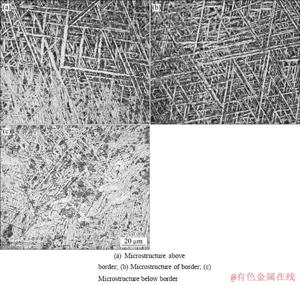 焊缝中心处沿厚度方向的组织如图5所示。图5(a)所示为交界处上方1 mm处的组织;图5(b)所示为两道焊道交界处的组织;图5(c)所示为交界处下方1 mm处的组织。