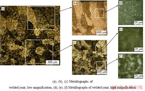 为了更好地探究外加磁场对钛合金焊缝组织的影响,对比分析磁场对组织的影响。图6所示为强度为8 mT、频率为10 Hz的磁场作用时焊缝组织。在焊缝的表层,组织呈柱状,与普通焊接焊缝中的柱状组织相似,但其生长方向是从表层向内部生长(图6(d)),从焊缝表层向母材过渡,其组织为明显的等轴状晶,只是晶粒的大小在不断减小,直到熔合线附近。