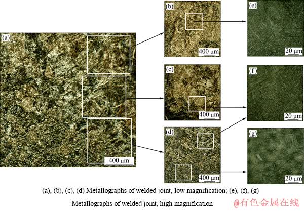 图7所示为无磁场作用时的焊缝组织。焊缝表层组织为等轴晶(图7(e)),向母材过渡时发现少量的柱状晶(图7(f))。焊缝表层组织从不加磁场时的等轴晶单方向伸长而逐渐转变为柱状组织,且随着磁场强度的加大逐渐变得粗大,其生长方向为热量传导方向,即晶粒从表层向内部生长。从表层向熔合线附近过渡的过程中发现,随着磁场强度的增加,柱状晶逐渐模糊消失,变为明显的等轴晶,晶粒的大小随着向HAZ延伸在不断减小,直到熔合线附近。通常情况下,Ti-6Al-4V焊缝的熔合区及熔合线附近为粗大的柱状晶组织,如图7(f)所示。当熔池受到纵向磁场作用时,搅拌的熔池不仅导致液态金属的浓度梯度大大降低,而且熔池的温度场得到重新分布并趋于稳定和均匀[20],磁场的施加抑制了普通焊接情况下的由熔合线向熔池中心生长方式,抑制了在熔合线内侧形成大量的柱状晶,如图6(e)所示。实验过程中发现在特定位置加载磁场后,出现了由柱状晶(图7(f))向等轴晶(图6(e))转变的现象,并有细化趋势。