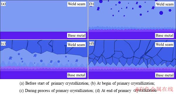为形象地描述界面层形成过程,建立了磁控作用下钛合金焊缝金属界面层结构及凝固过程示意图,如图8所示。