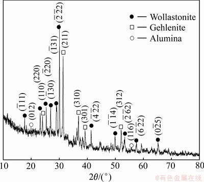 晶面间距的d值一致,另一种片状颗粒的晶面间距d=0.284 nm,与钙铝黄长石的(211)晶面间距的d值一致。进一步对硅灰石颗粒进行选区电子衍射分析(SAED)(见图3(b)中插图),可以看出,析出的硅灰石为单晶,衍射花样排列规则,说明样品的晶型较好。