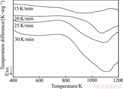 在不同升温速率下测定原料混合粉末的DSC曲线如图4所示。由图4可以看出,在前驱体分解过程中有一个明显的吸热峰,随着升温速率增加,DSC曲线上析晶峰温度逐渐增加。通过动力学数据可获得玻璃陶瓷析晶过程晶体生长的信息,有必要对其进行详细研究。