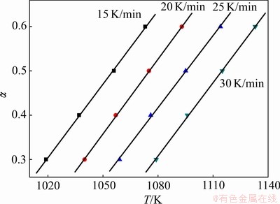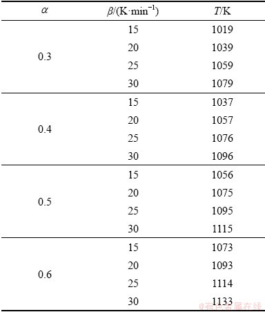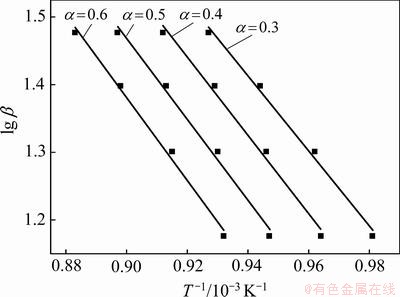 对1/T作图,图中直线的斜率为-E/R。根据式(4)可计算得到活化能E。在不同升温速率下各转化率对应的温度是不同的,如表3所示。根据表3中的数据绘制转化率
