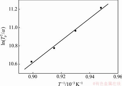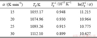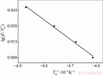 对1/Tp作图,图中直线的斜率为E/R,根据公式(5)可计算得到活化能E。不同升温速率