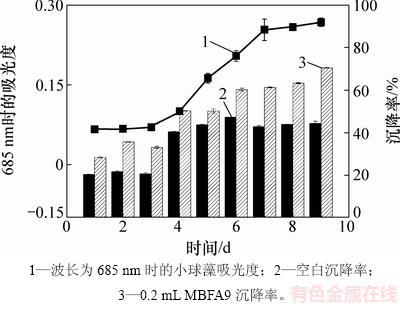 刘洁霞[23]对雪绿球藻(Chlorococcum nivale)、椭圆绿球藻(Chlorococcum ellipsoideum)、栅藻(Scenedesmus sp.)这3种绿藻早期生长阶段、指数生长阶段、平稳阶段的胞外多糖产量进行测定,发现这3种绿藻在指数生长阶段会产生更多的胞外多糖。小球藻在指数生长期添加MBFA9的效果不如在平稳期添加的效果好,这是由于指数生长期小球藻会分泌更多的胞外多糖,它们与培养液中金属离子络合,从而影响沉降效果[24-25]。